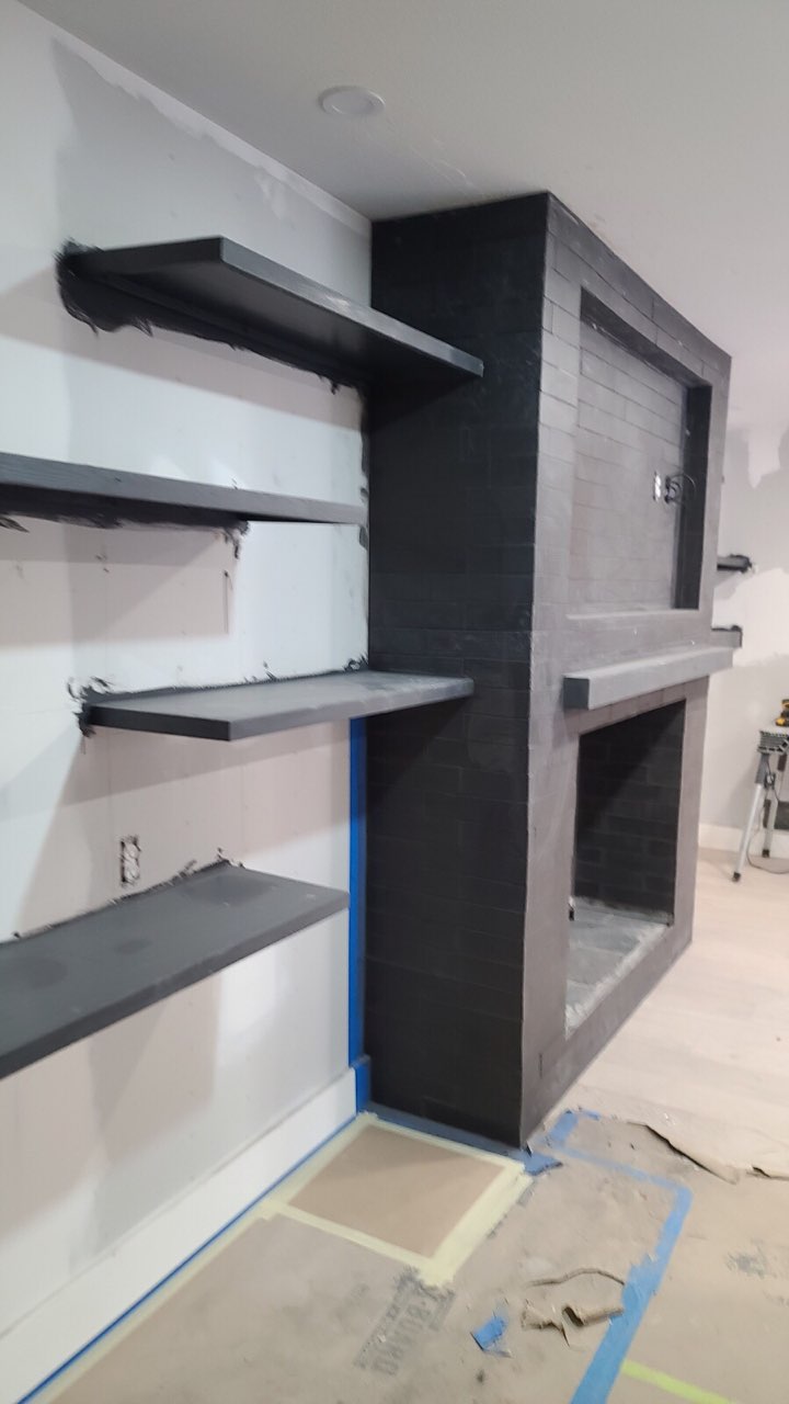 The fireplace has been refreshed with tile and a nook created for a flat screen TV surrounded by floating shelves