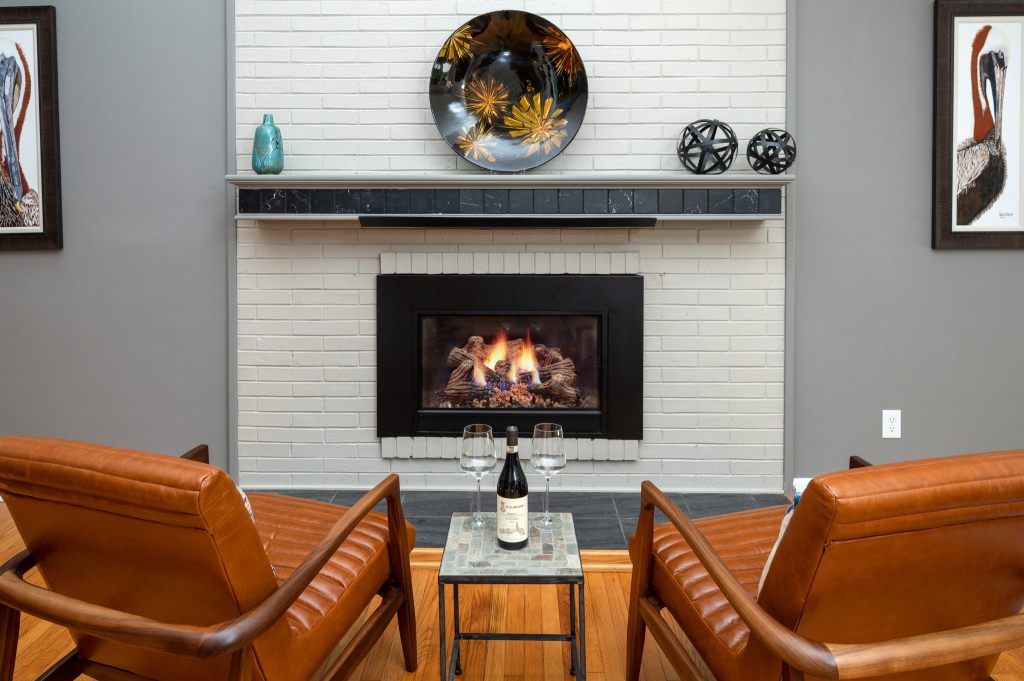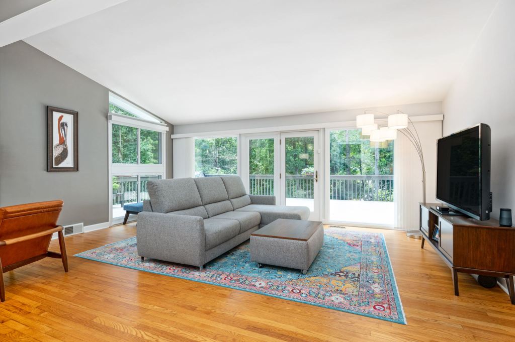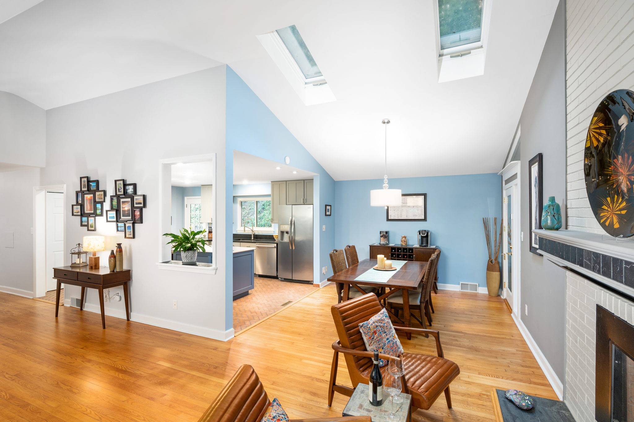 Vaulted ceilings, soaring brick fireplace, skylights and walls of windows give this home timeless Mid-Century Modern appeal and bring the outside in.