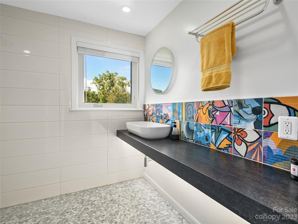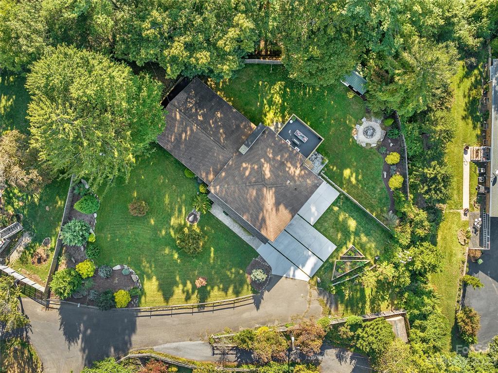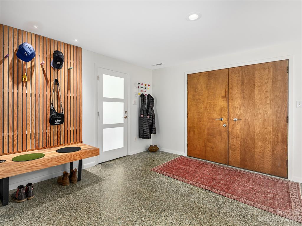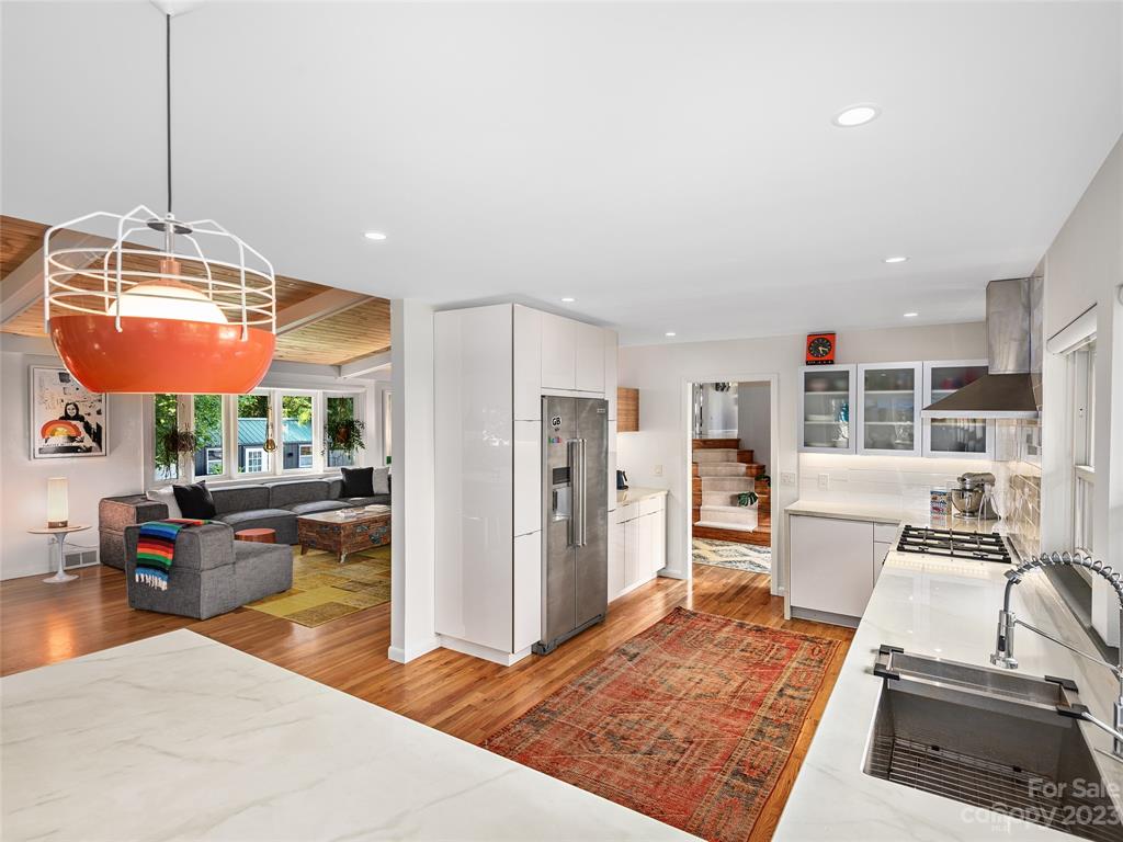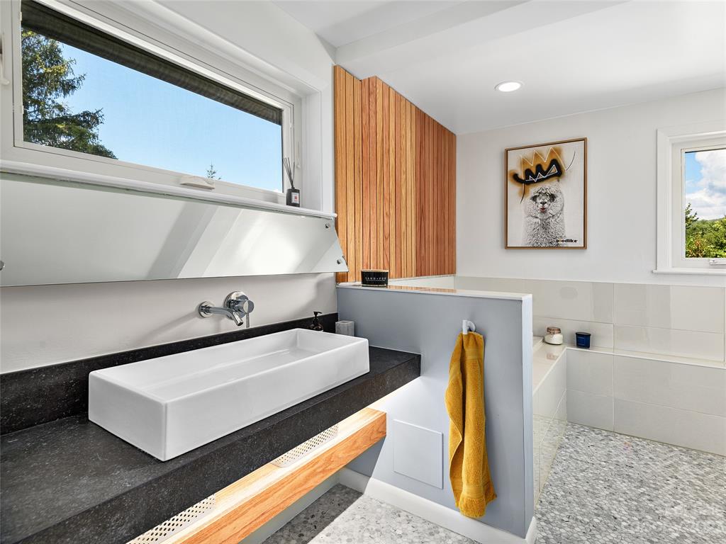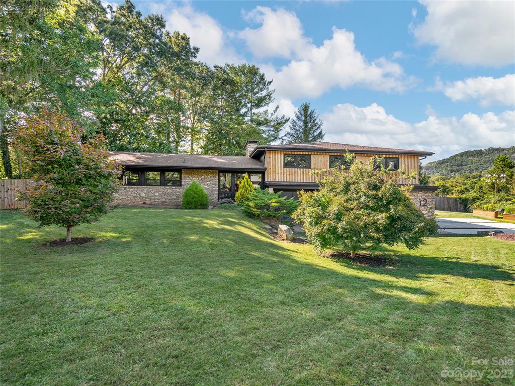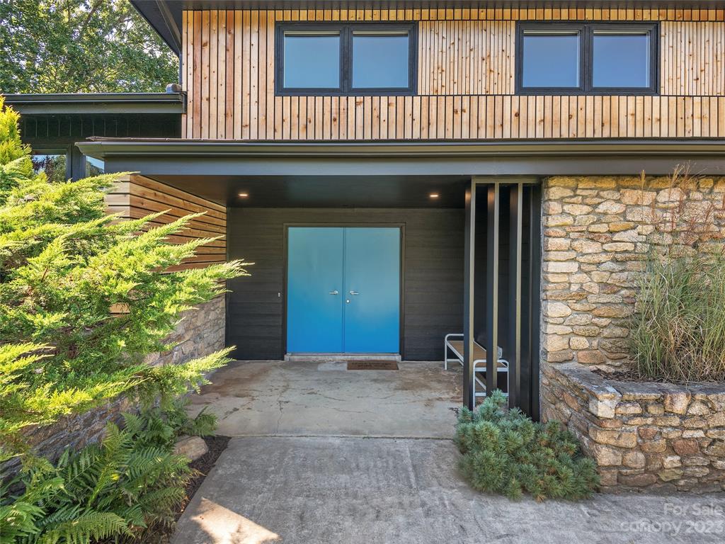 Here are the official details from Gretchen: “Stunning mid-century modern (featured in NC Modernist) in North Asheville’s prestigious Lake View Park neighborhood – moments from Beaver Lake! Located in a quiet cul-de-sac, this split-level home with I-beam construction, has an amazing flow for entertaining with indoor/outdoor living and panoramic mountain views. Incorporating all the modern and sophisticated touches desired for today’s living, this home features a chef’s kitchen with a Bertazzoni 36″ oven, dual-waterfall Dekton countertops, entry-level terrazzo floors, Nest heat/cooling and marble floor bathrooms with curbless showers. Beautifully landscaped front and rear gardens feature a fire pit, chicken coop, fruit trees, covered patio and permitted workshop (would make a great office/studio). Downstairs +/- 1,100 sqft of additional space (not included in HLA, giving 4260 sq ft total) with quite possibly the only mid-century fortified bomb shelter in Asheville (did someone say wine cellar)? This is your opportunity to own a very special home.”