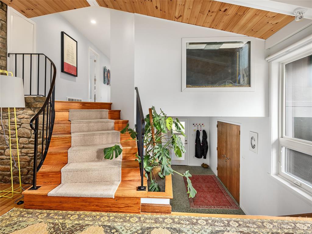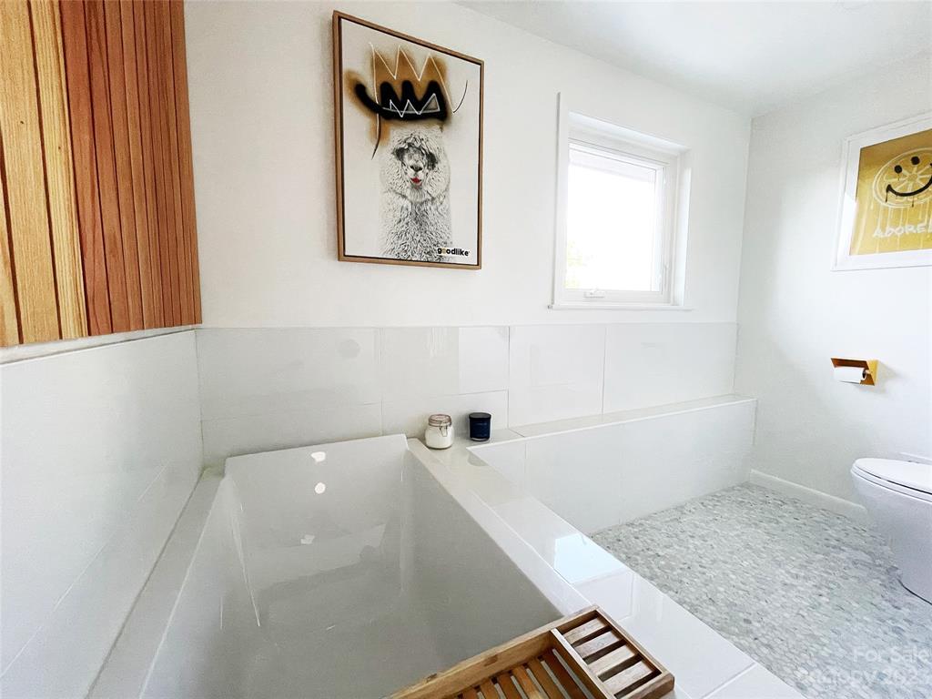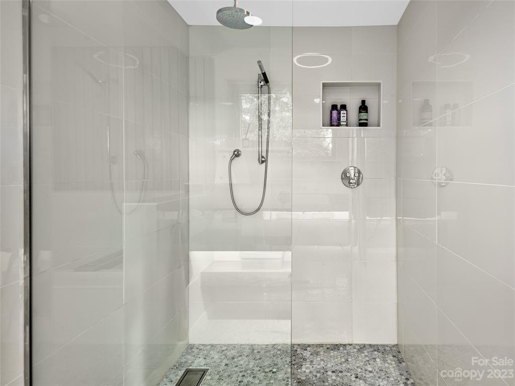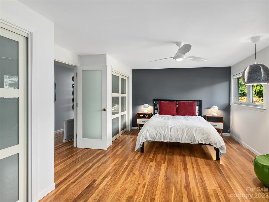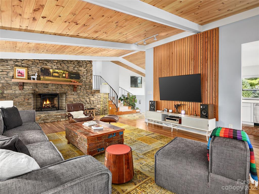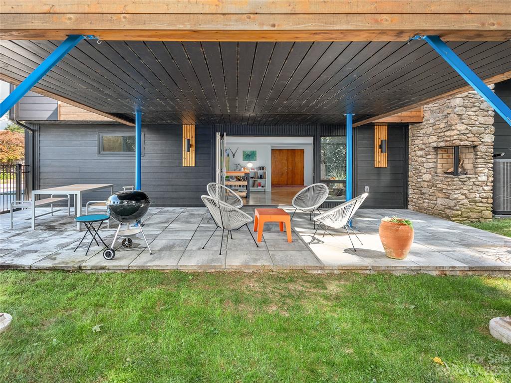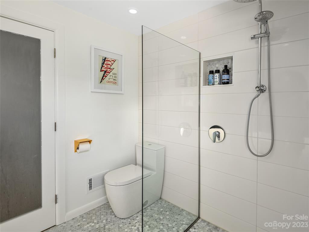 Here are the official details from Gretchen: “Stunning mid-century modern (featured in NC Modernist) in North Asheville’s prestigious Lake View Park neighborhood – moments from Beaver Lake! Located in a quiet cul-de-sac, this split-level home with I-beam construction, has an amazing flow for entertaining with indoor/outdoor living and panoramic mountain views. Incorporating all the modern and sophisticated touches desired for today’s living, this home features a chef’s kitchen with a Bertazzoni 36″ oven, dual-waterfall Dekton countertops, entry-level terrazzo floors, Nest heat/cooling and marble floor bathrooms with curbless showers. Beautifully landscaped front and rear gardens feature a fire pit, chicken coop, fruit trees, covered patio and permitted workshop (would make a great office/studio). Downstairs +/- 1,100 sqft of additional space (not included in HLA, giving 4260 sq ft total) with quite possibly the only mid-century fortified bomb shelter in Asheville (did someone say wine cellar)? This is your opportunity to own a very special home.”