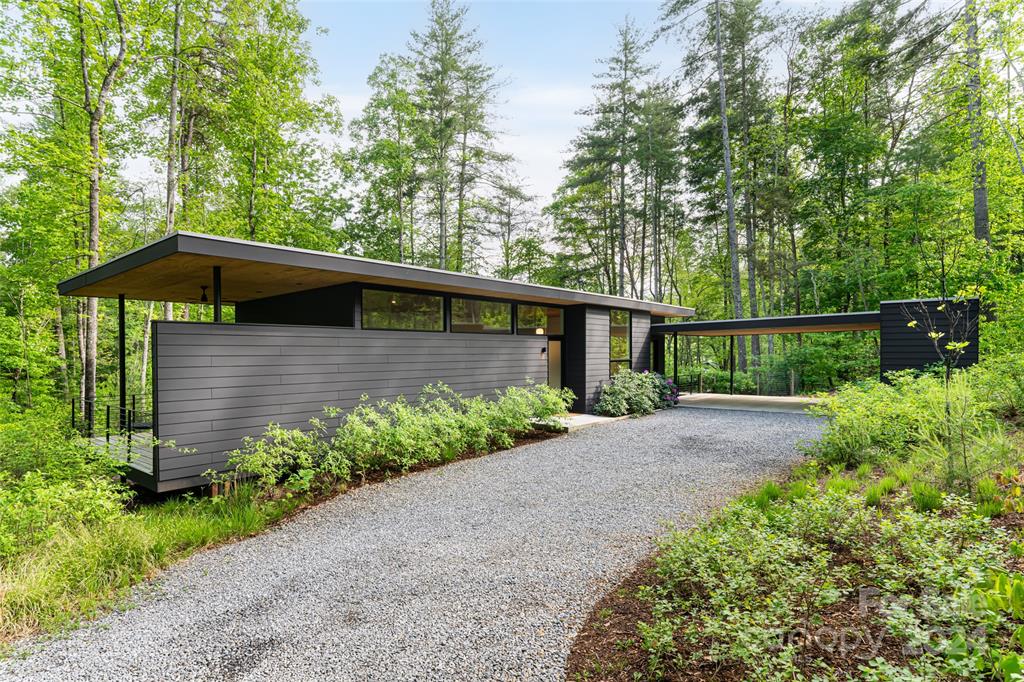 This open and bright mid-century modern inspired home offers a modern cabin-feel with high-end touches on nearly an acre